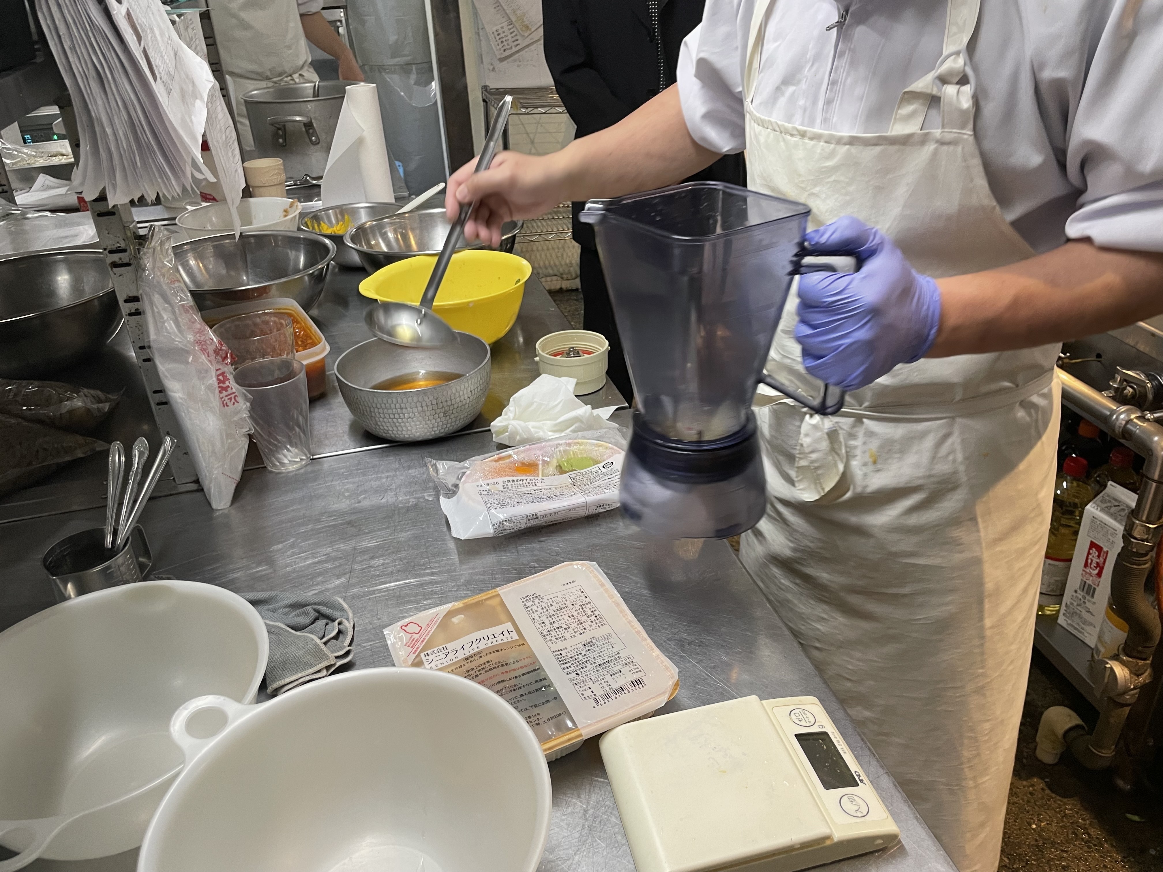 グループ会社のイートハピネスで、ある支援学校様の修学旅行のお弁当についてのご相談をいただきました。咀嚼や嚥下(食べ物を噛んだり飲み込むこと)が難しい方に対して、ムース食やミキサー食など、食べていただきやすいように対応しています。普通食とは見た目が変わってしまいますが、お出汁を加えるなど、味わって食べてやすいようにも一工夫しています。